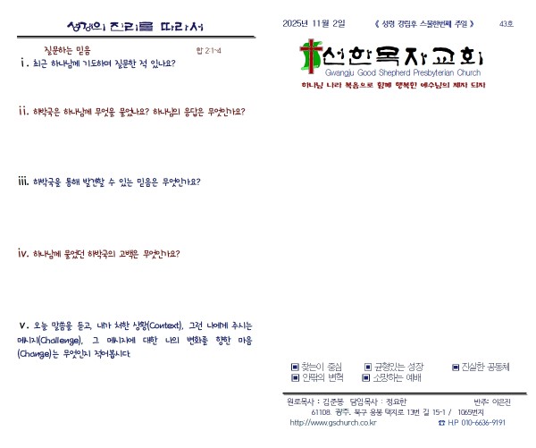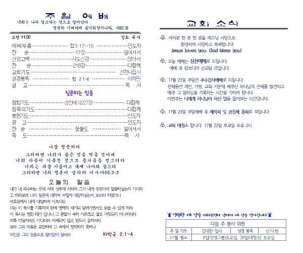 2025. 11. 2. 주일예배 주보 페이지 정보 작성자 정요한 목사 작성일25-11-02 09:52 조회86회 댓글0건 관련링크 이전글 다음글 목록 본문 2025. 11. 2. 주일예배 주보 댓글목록 등록된 댓글이 없습니다. 이전글 다음글 목록