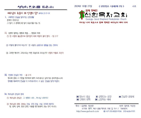 2024. 10. 27. 주일예배 주보 페이지 정보 작성자 정요한 목사 작성일24-10-26 16:01 조회725회 댓글0건 관련링크 이전글 다음글 목록 본문 2024. 10. 27. 주일예배 주보 댓글목록 등록된 댓글이 없습니다. 이전글 다음글 목록