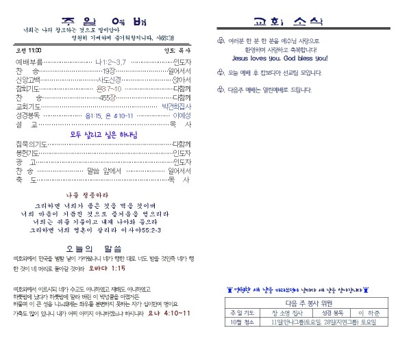 2025. 10. 12. 주일예배 주보 페이지 정보 작성자 정요한 목사 작성일25-10-18 16:50 조회41회 댓글0건 관련링크 이전글 다음글 목록 본문 2025. 10. 12. 주일예배 주보 댓글목록 등록된 댓글이 없습니다. 이전글 다음글 목록