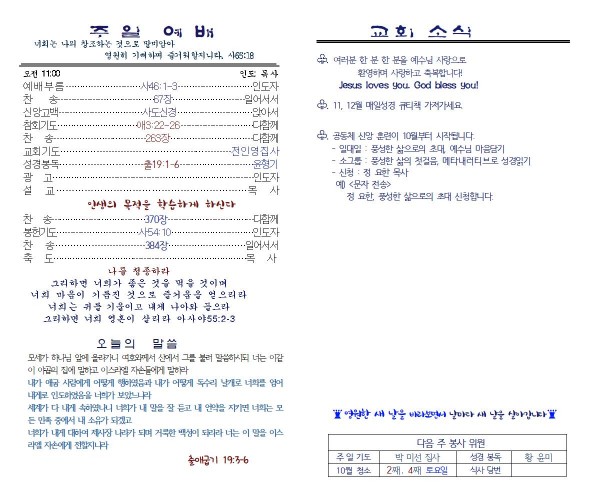 2023. 10. 15. 주일예배 주보 페이지 정보 작성자 정요한 목사 작성일23-10-14 20:19 조회1,098회 댓글0건 관련링크 이전글 다음글 목록 본문 2023. 10. 15. 주일예배 주보 댓글목록 등록된 댓글이 없습니다. 이전글 다음글 목록
