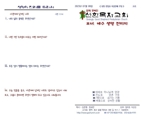 2023. 07. 09. 주일예배 주보 페이지 정보 작성자 정요한 목사 작성일23-07-08 17:41 조회1,195회 댓글0건 관련링크 이전글 다음글 목록 본문 2023. 07. 09. 주일예배 주보 댓글목록 등록된 댓글이 없습니다. 이전글 다음글 목록